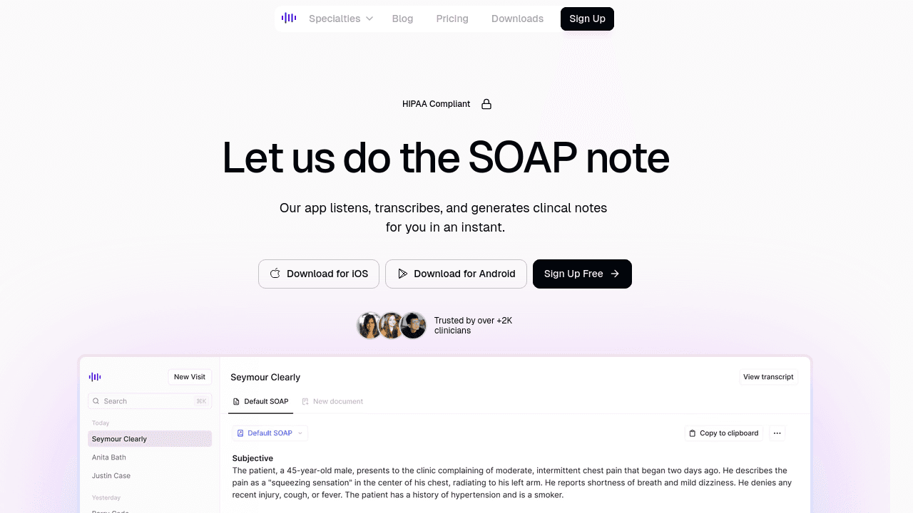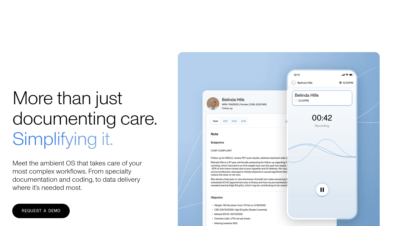 Why It Stands Out: Suki highlights its adaptable interface and compliance features, making it a solid choice for specialties with strict regulatory requirements. While it is effective at creating notes, its ambient listening features are slightly less advanced than the market leaders.